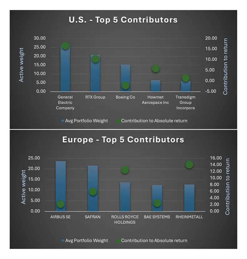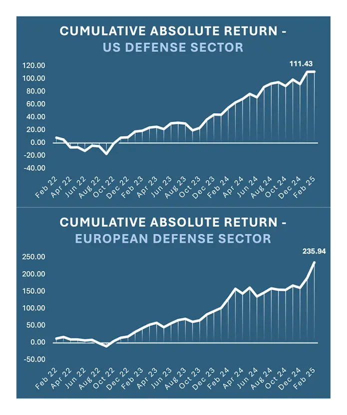 The defense and aerospace sector continues to demonstrate resilience and strategic importance in a time of heightened geopolitical uncertainty. While U.S. defense spending remains dominant globally, a notable shift is underway as European nations ramp up their military commitments and defense budgets, partially in response to waning U.S. support for Ukraine. There may also be opportunities in adjacent European sectors like cybersecurity, logistics, and advanced manufacturing. This evolving landscape has catalyzed exceptional equity performance among top European defense companies, outpacing their U.S. counterparts in 2024.