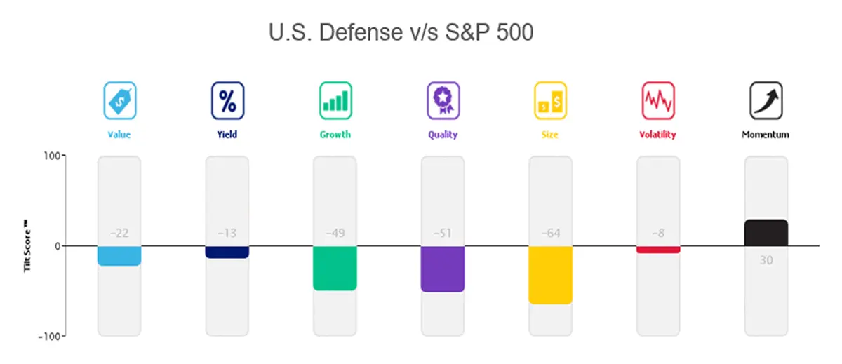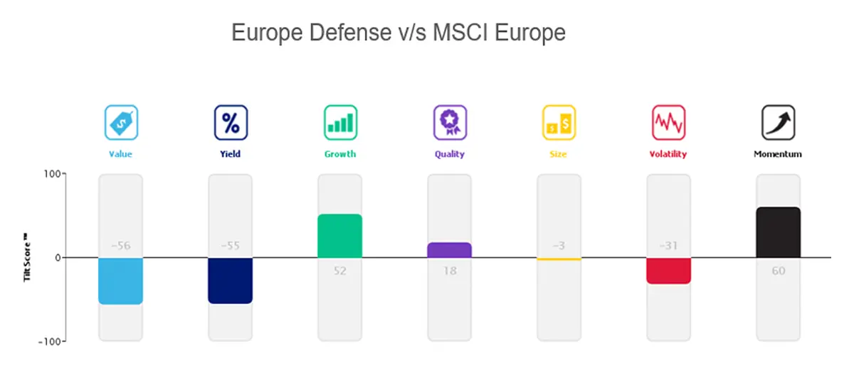 Although the valuations of the top 10 defense stocks in both regions are relatively expensive, these stocks show a favorable momentum compared to their respective markets. Additionally, the European defense industry demonstrates a positive tilt towards Growth and Quality when compared to MSCI Europe.