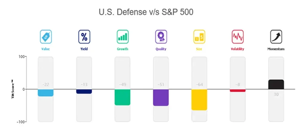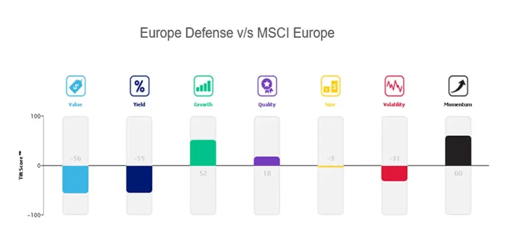 Although the valuations of the top 10 defense stocks in both regions are relatively expensive, these stocks show a favorable momentum compared to their respective markets. Additionally, the European defense industry demonstrates a positive tilt towards Growth and Quality when compared to MSCI Europe.