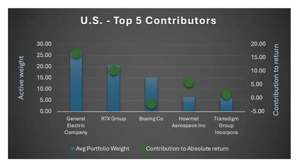U.S. defense giants like GE and the RTX Group have shown resilience over the past year. Demand for GE Aerospace’s aftermarket services boosted in 2024, while many airlines, including Boeing, experienced production challenges, resulting in a performance surge of nearly 70% in 2024. However, the region’s defense sector performance was largely dragged down by Boeing’s underperformance, which returned -2.06%, significantly behind those of its European competitor, Airbus.