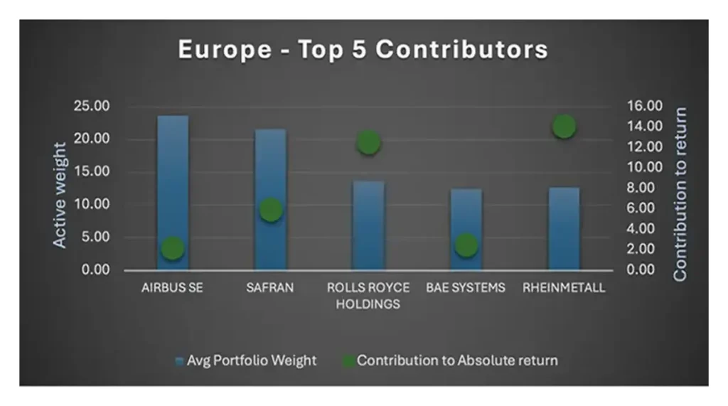 The defense and aerospace sector continues to demonstrate resilience and strategic importance in a time of heightened geopolitical uncertainty. While U.S. defense spending remains dominant globally, a notable shift is underway as European nations ramp up their military commitments and defense budgets, partially in response to waning U.S. support for Ukraine. There may also be opportunities in adjacent European sectors like cybersecurity, logistics, and advanced manufacturing. This evolving landscape has catalyzed exceptional equity performance among top European defense companies, outpacing their U.S. counterparts in 2024.