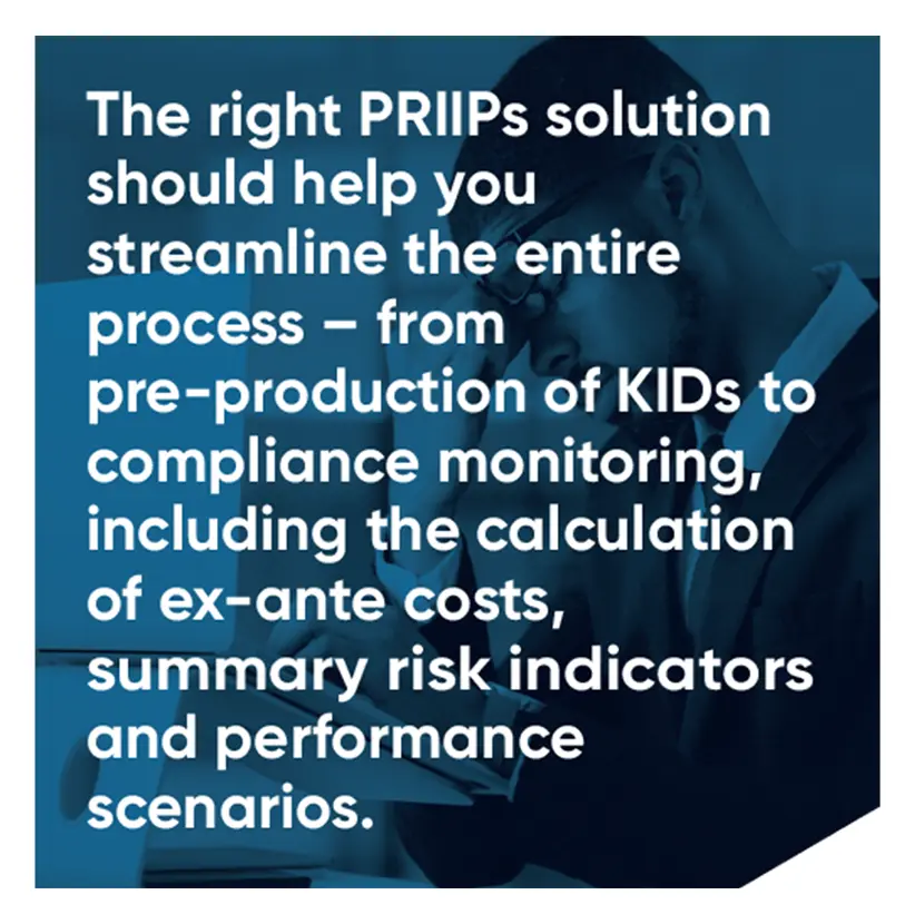 The right PRIIPs solution should help you streamline the entire process – from pre-production of KIDs to compliance monitoring, including the calculation of ex-ante costs, summary risk indicators and performance scenarios. It should improve operational efficiency, maintain data integrity, and reduce risk and total cost of ownership. Whether you build/modify, buy or outsource, here are the eight main attributes you should look for: