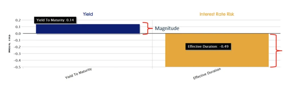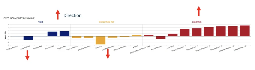 Fixed Income metric tilts point upward to indicate the portfolio is more exposed to a metric than the benchmark while pointing downward indicates lower exposure than the benchmark. The benchmark is represented as the zero line. This allows a quick and clear visual representation of where the portfolio is positioned