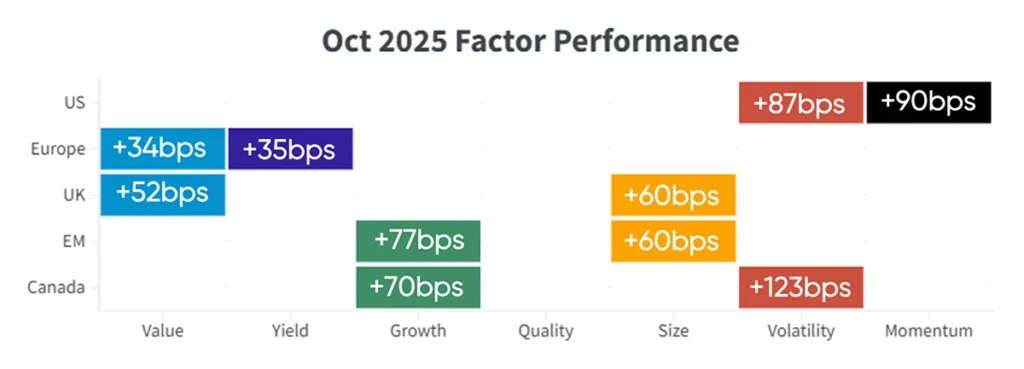 Alongside Volatility, the Fed’s rate cuts also supported momentum stocks in the U.S. equity market. Strong performances from leading growth names, particularly in the technology and communication sectors, fuelled further gains, as existing market leaders continued to outperform. This trend was consistent with the ongoing outperformance of momentum stocks seen in the previous month. Growth stocks delivered exceptional returns in October 2025, driven by robust earnings from major tech and communication companies.