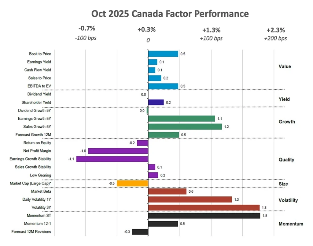 Mirroring trends from the previous month, the Canadian market continued to outperform the Growth, Volatility, and Momentum subfactors. Momentum names benefited from sustained demand for higher-growth and higher volatility exposures, supported by a prevailing risk-on sentiment and favorable earnings revisions among key momentum stocks. As investors rotated toward companies with stronger recent price performance and improving fundamentals, these stocks outpaced more traditional or value-oriented Canadian equities.