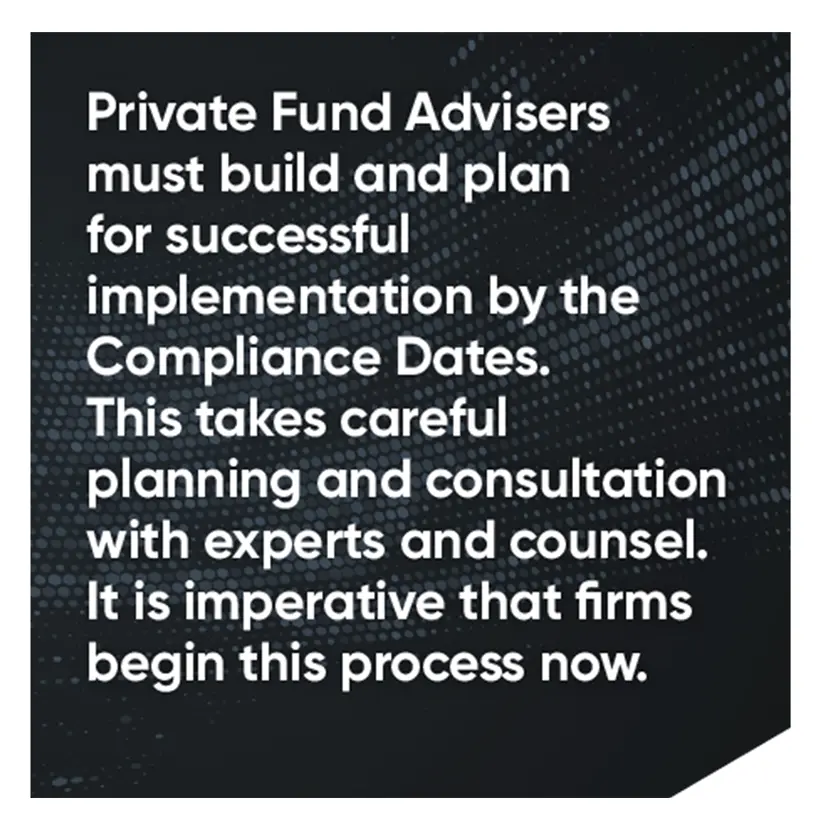 Private Fund Advisers must build and plan for successful implementation by the Compliance Dates. This takes careful planning and consultation with experts and counsel. It is imperative that firms begin this process now.