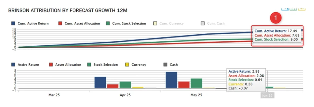 Figure 2 shows that the same manager depicted in Figure 1 can attribute recent performance results to their allocation to a particular investment factor: Forecast 12 Month Growth, a measure of the expected earnings growth for a stock or portfolio over the next 12 months.