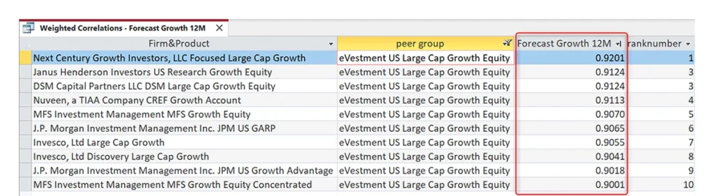 Figure 3 displays the eVestment Large Cap Growth group data, which incorporates active manager returns and market relative factor returns, for the three years ending July 31, 2025. It represents the funds within the eVestment US Large Cap Growth Category that have the highest positive (weighted) correlation to Style’s Forecast Growth 12 Month Factor. All of these managers had a correlation coefficient hovering around 1.0, indicating a robust statistical relationship between their monthly active returns and the 12 Month Forecast growth’s market-relative active returns.