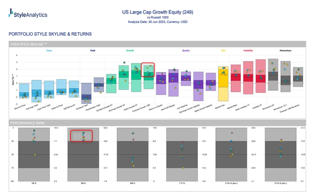 Figure 4 shows the performance of the top half of each factor relative to the overall benchmark using the Confluence Style Portfolio Analyzer. For the three-month period ending in June 2025, using the benchmark as the focal point, there is a clear and strong relative performance of growth factors, marked by notable strength from the 12 Month Forecast Growth Factor (e.g., 9.3%).