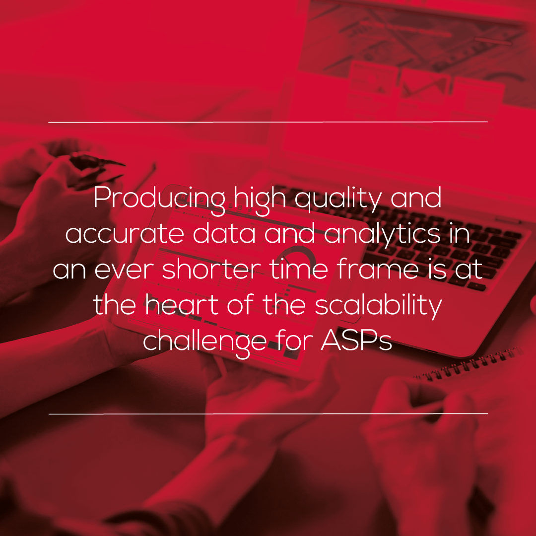 Achieving scale with flexibility is only possible with the right technology strategy and partners. Positive results can be achieved when systems can manage high levels of data quality, elastic scalability, and flexible output and distribution. These are the foundations of self-service analytics, where clients and stakeholders can connect to interfaces to get the analyses and data they need in the format they want. Behind the scenes, ASPs can efficiently ensure data quality and accuracy with data controls, automation and workflow, and provide flexibility with mature analytics, configurable user interfaces and Web APIs.