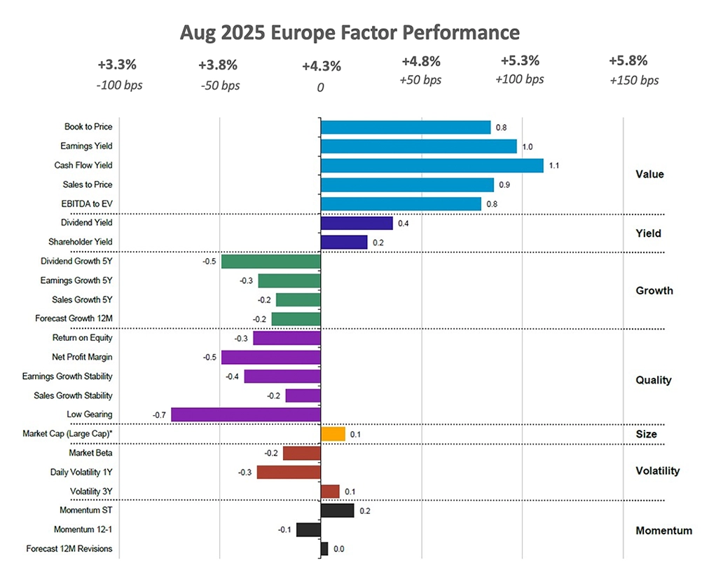 European Equities recorded modest gains in August 2025, delivering a positive return of 4.3% following a negative performance in the previous month. The region’s outperformance was primarily driven by the Value and Yield subfactors, with Value stocks outperforming the broader market by an average of approximately 92bps.