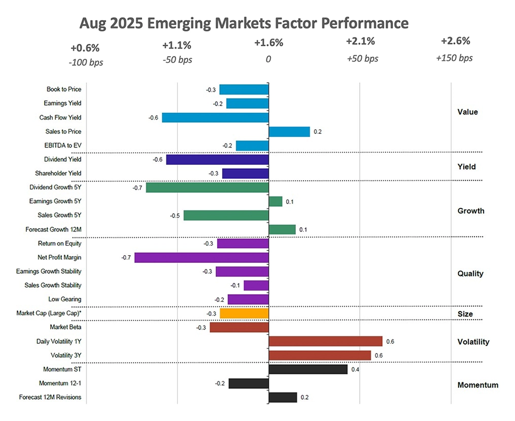 Emerging Markets posted a positive return of 1.6% in August, an improvement over the previous month. Compared to July, large-cap value stocks saw weaker performance, while Volatility and Momentum factors showed notable gains. Compared to the previous month, emerging markets experienced a decline in the performance of large-cap Value equities. In contrast, Volatility and Momentum strategies outperformed, likely driven by ongoing macroeconomic and monetary uncertainties.