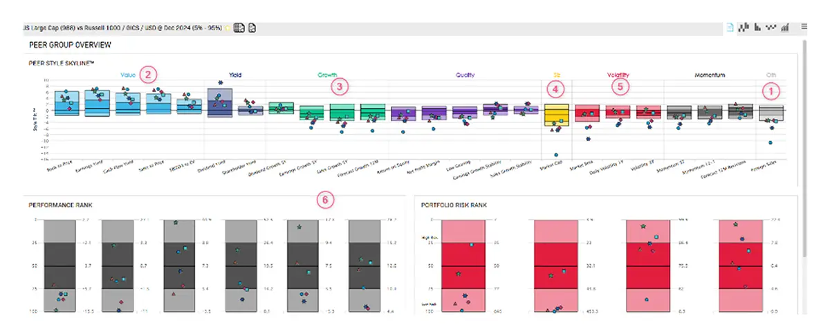 Style Analytics Peer Insights was then used to analyze these portfolios further, revealing a distinct profile: they were generally cheaper, slower-growing, lower-volatility, and smaller-cap versus the Russell 1000.