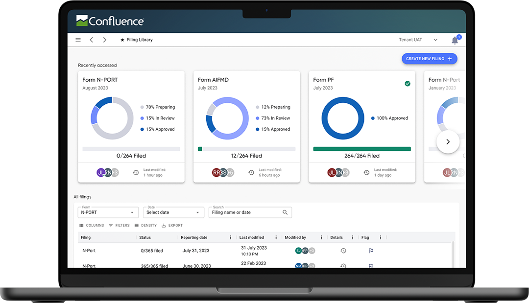 As the demand for regulatory transparency increases, a scalable and automated reporting solution is necessary to respond to rapid compliance change. Count on Confluence Omnia to help you better manage Form PF, AFIMD, MMFR, N-Port (18f-4) and other global regulations.