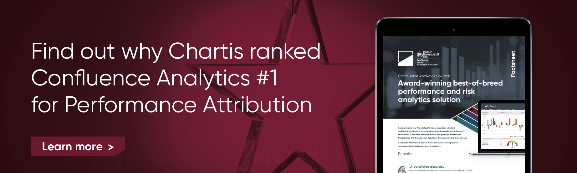 In its inaugural year, Chartis’ RiskTech BuySide50 awards recognized Confluence Analytics for its cloud-based performance and risk solution, in addition to ranking it a top 20 firm for its breadth and depth of services, excellence in performance attribution and risk analysis, and overall platform breadth.
