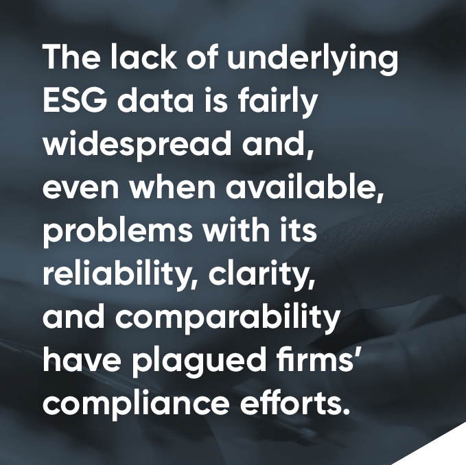 Realistically, E.U. regulatory efforts addressing ESG data (or indeed such efforts anywhere else) face a substantial road ahead before they become effective. In other words, investment managers will probably encounter a multi-year period in which some disparate, incomplete, and unreliable data will continue to exist in the marketplace. Their current priorities, therefore, must acknowledge and reflect this reality. Or, as Mantovani put it, “The path should be toward robust but flexible ESG data management and reporting.”