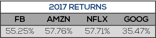 Facebook’s user growth has slowed recently, but their advertising-based business model can however reach over two billion daily users. Amazon has seen success expanding into business areas where they can see short-term profitability, for example Amazon Web Services, Twitch.tv, and Whole Foods. Netflix has capitalized on the cord-cutting trend in television, becoming the market leader in subscription-based content. They have added users quickly and expanded original programming, with both approaches spurring growth. Google, similar to Facebook, capitalizes on advertisement via their leading search platform. Combined they have enjoyed a tremendous run in the recent bull market, up 44% in 2017 which outpaces the S&P 500’s otherwise unbelievable performance of 21.7% over the same period. The four FANG stocks contributed about 2.7% of the S&P 500’s total performance in 2017.