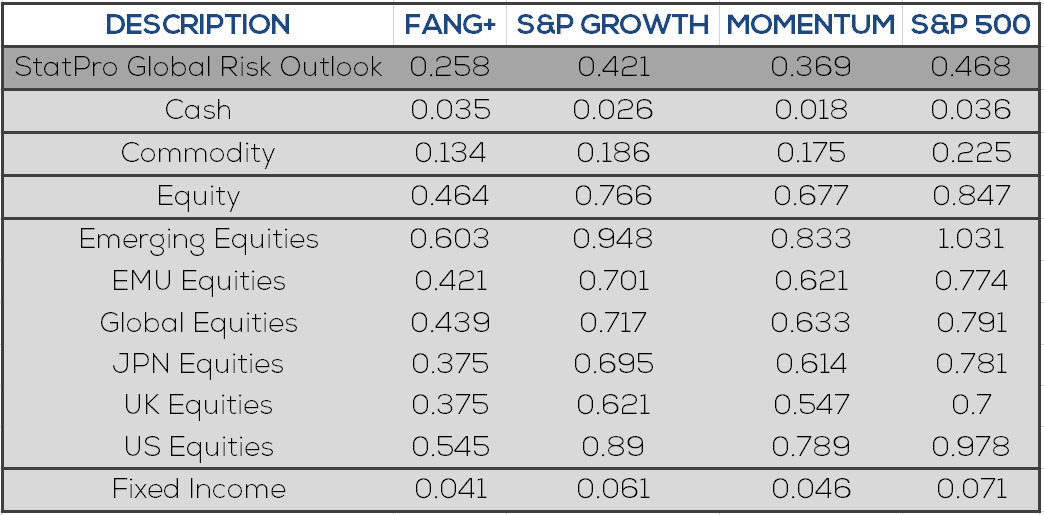 The impact the FANG stocks can have on our portfolio is real – even in a globally diversified asset manager. Whereas we know that changes in the S&P will move our portfolio in a significant way, we must also understand the constituents within the S&P and how they may affect the portfolio in turn. We can approach this analysis in our Global Risk Outlook portfolio by reviewing beta sensitivities for all equity holdings to the FANG+ stocks as well as other equity indices of interest.