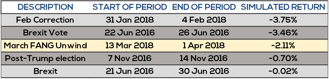 Over the period from March 13 to April 1, Facebook was entrenched in a data scandal, coinciding with a general pullback in the tech sector. To measure how well StatPro Revolution’s Alpha module could have predicted the impact to our Global Risk Outlook portfolio, we use the NYSE FANG+ Index as representative of growth tech stocks. The FANG+ is an expanded list of ten constituents: Facebook, Amazon, Netflix, and Google, as well as Apple, Alibaba, Baidu, NVIDIA, Tesla, and Twitter. March 13 was also the 52-week high for the FANG+ index, creating a window of interest around which we will run our historical scenario analysis: