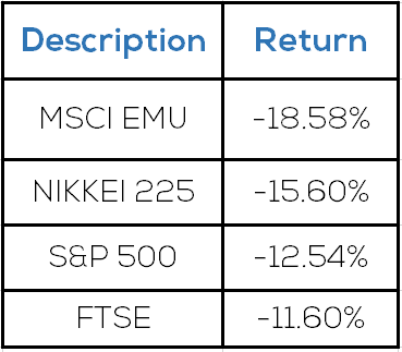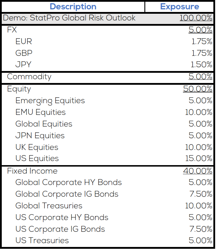 In this global risk outlook blog series, the sample portfolio will be rebalanced quarterly to maintain reporting integrity and will follow: 50% in global equities including emerging, and developed markets with bias towards US, UK and Europe, 40% in global fixed income spanning corporate, sovereign, high yield and investment grade, 5% in FX trading across EUR, GBP and JPY, and 5% in global commodities.