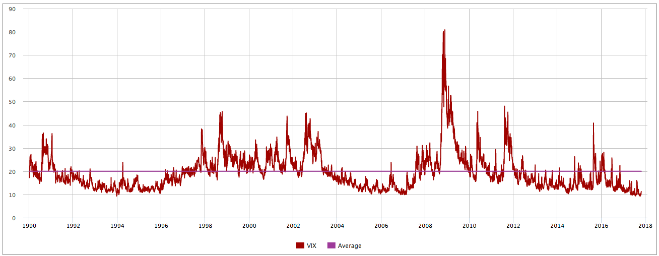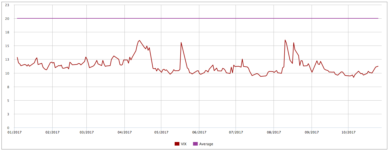 On October 5th the S&P 500 reached a historic high of $2,552, while the VIX reached a record low of 9.19. The year to date average* is not much higher, sitting at 10.8. For reference, since the VIX was created in 1990, the average level is near 20.