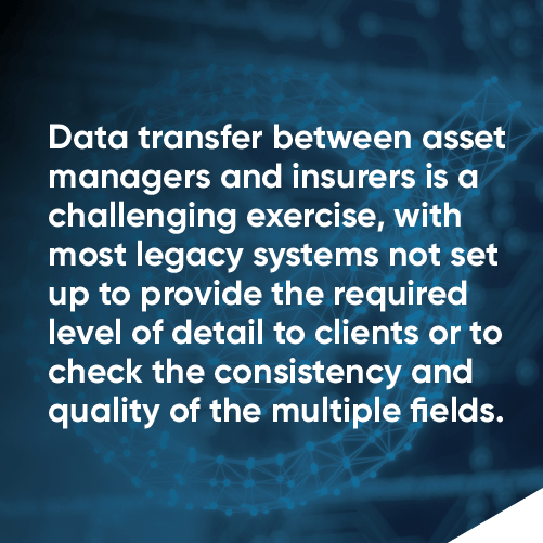 These calculations require a combination of best-of-breed proprietary pricing libraries and stress testing engines via an analytical platform. In addition, the data transfer between asset managers and insurers is a challenging exercise, with most legacy systems not set up to provide the required level of detail to clients or to check the consistency and quality of the multiple fields.