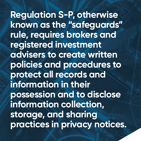 Regulation S-P, otherwise known as the “safeguards” rule, requires brokers and registered investment advisers to create written policies and procedures to protect all records and information in their possession and to disclose information collection, storage, and sharing practices in privacy notices.