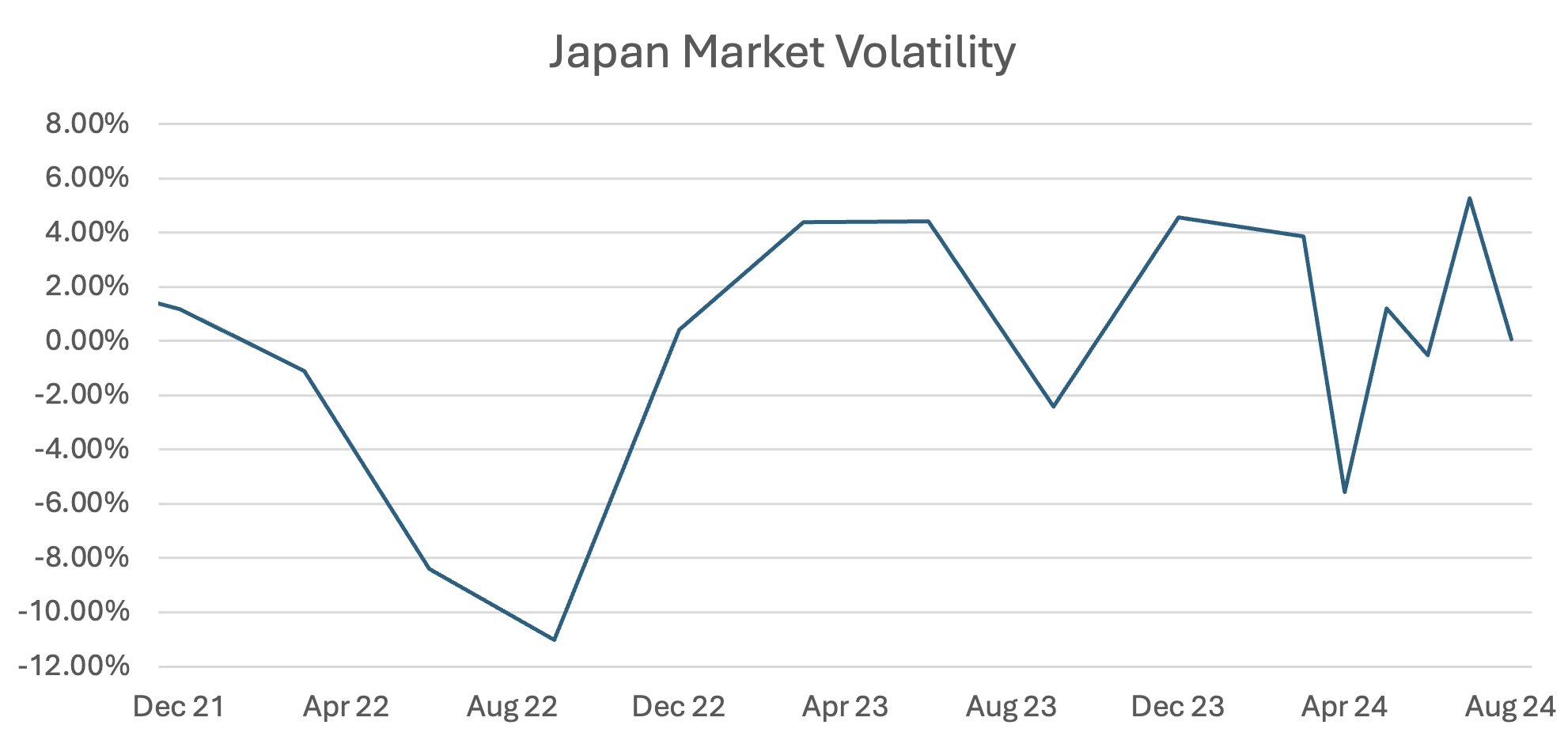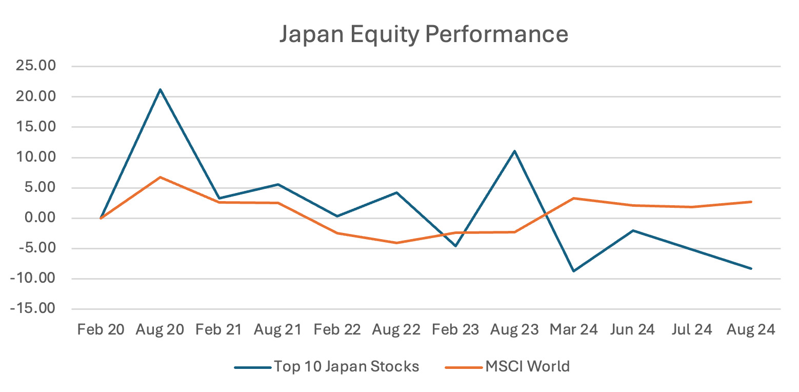 Japanese equities began the year with steady gains, driven by strong earnings and optimism around wage increases. After surpassing its 1989 peak in late February, the market experienced a decline by the end of July 2024, shortly followed by the biggest single-day retreat in early August, highlighting the market's volatile nature.