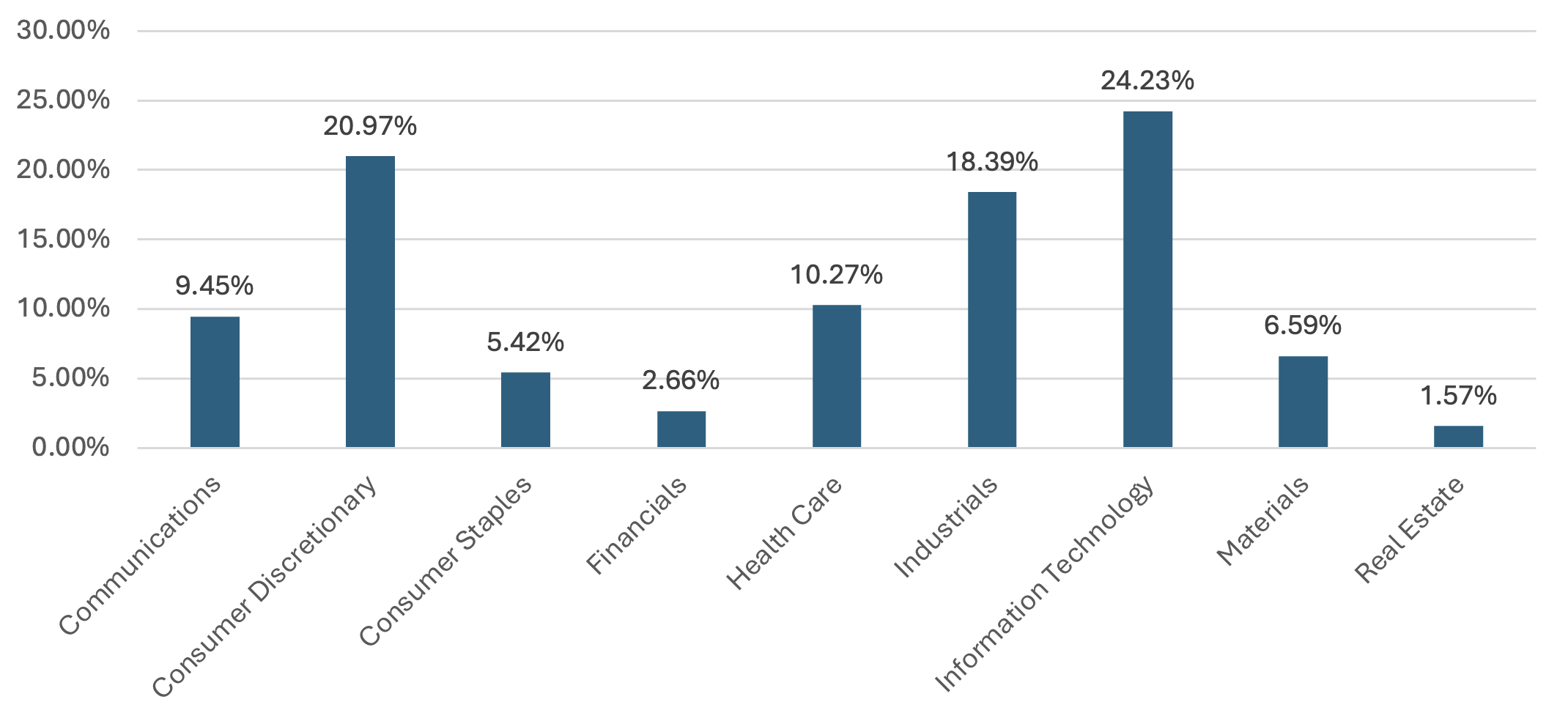 As shown in the chart, Industrials, Consumer Discretionary, and Information Technology dominate the index, accounting for approximately 64% of the total index. A closer look at the valuation performance of these sectors reveals further insights.
