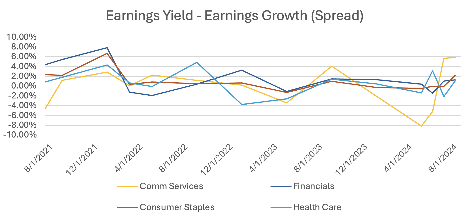 Since the start of 2024, the communication services sector has undergone a significant shift in the Earnings Yield vs. Earnings Growth spread. Initially, the year favored the Value subfactor with a focus on earnings yield, but by mid-year, growth had taken the lead in driving performance, while the spread has been consistent for the remaining sectors.