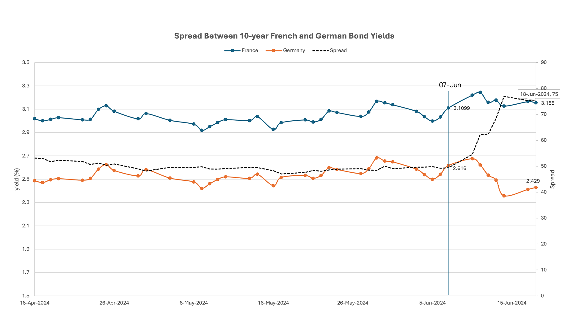 Figure 4: 10-year French and German Bond yields with Spread.