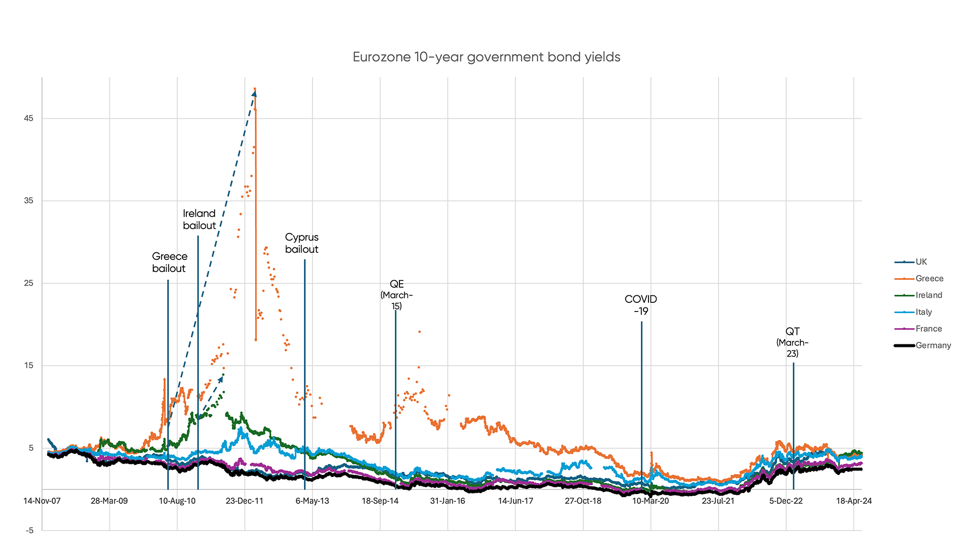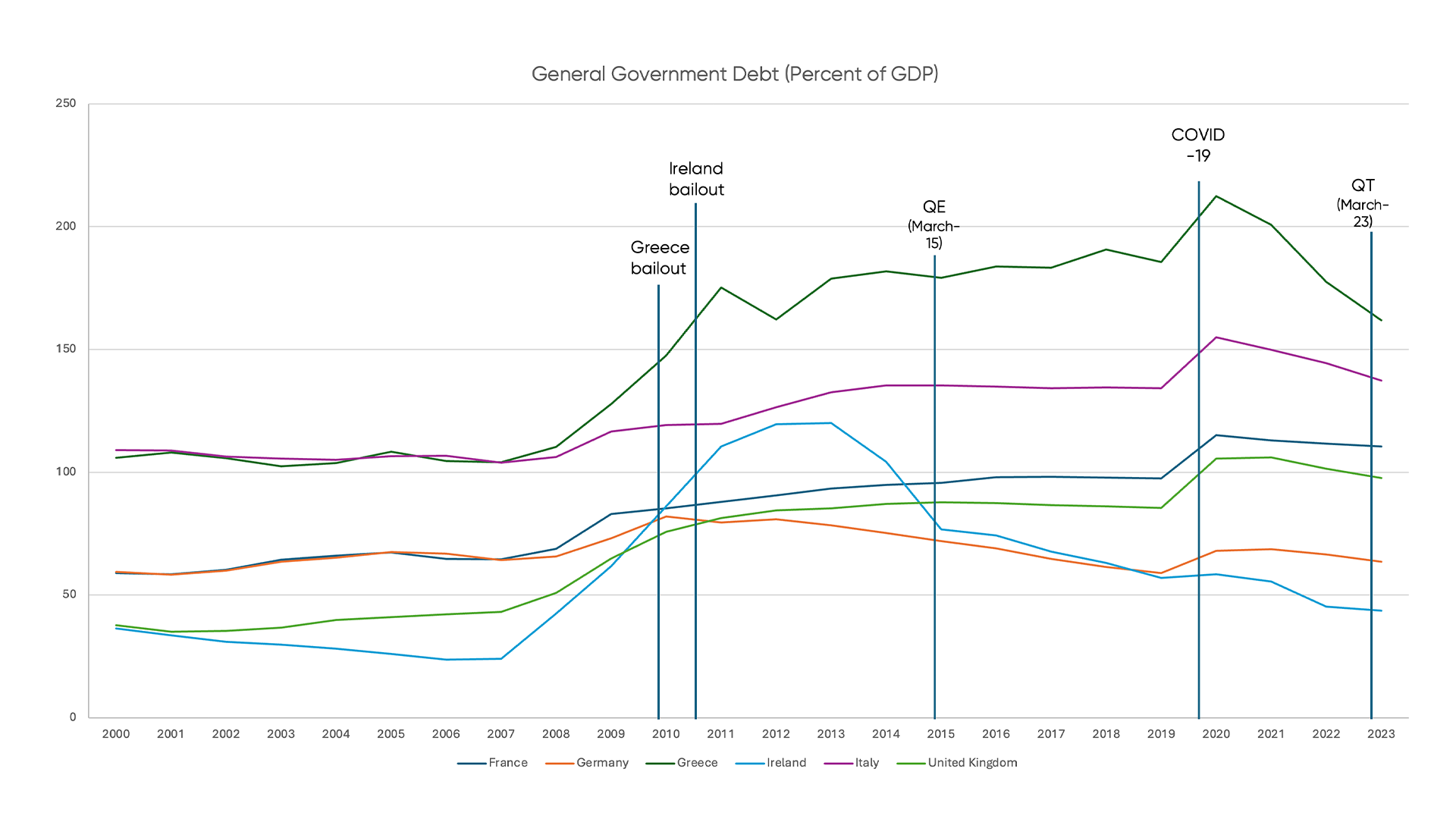 Historical Debt Comparison France, Germany, Greece, Ireland, Italy and the UK: