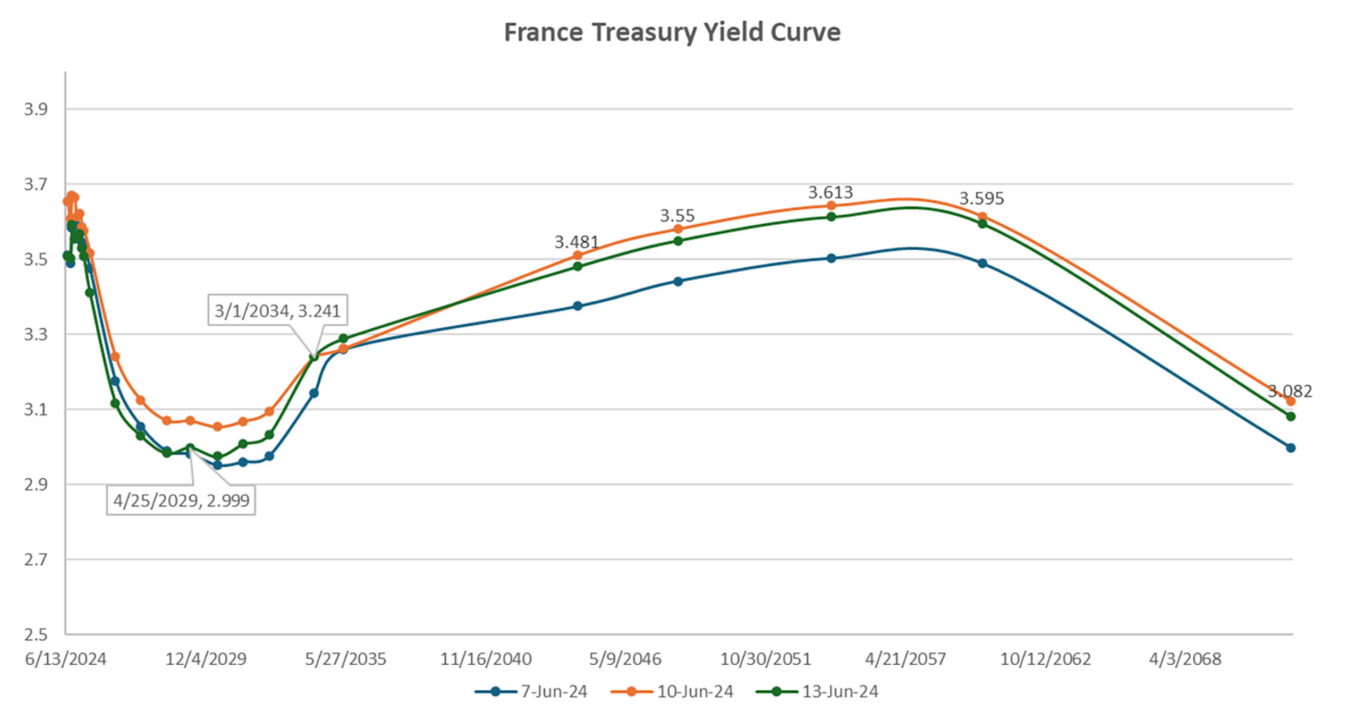 Figure 5: French Treasury Yield Curve. Highlighted rates correspond to the yields of Jun 13th, 2024.