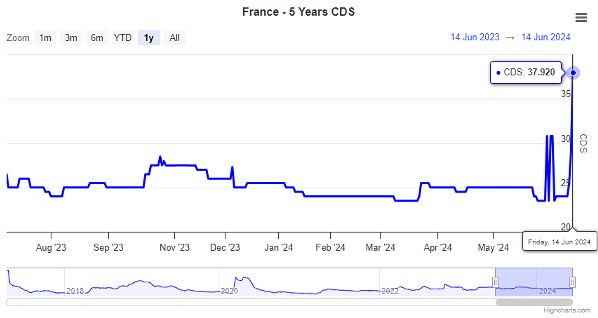 On June 18th, the France 5-Year Credit Default Swap (CDS) rose to 38.44 basis points, marking its highest level since May 2020. This metric is a crucial indicator used by investors to gauge the credit risk associated with French sovereign debt.
