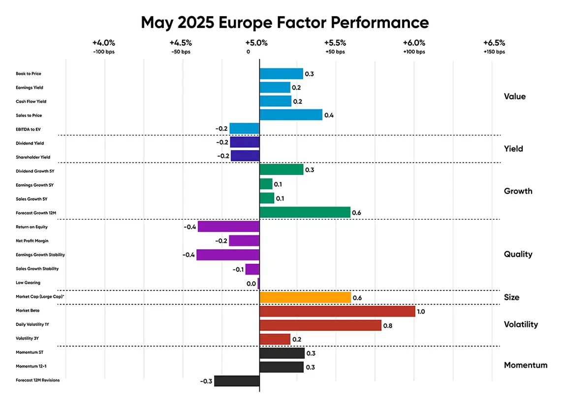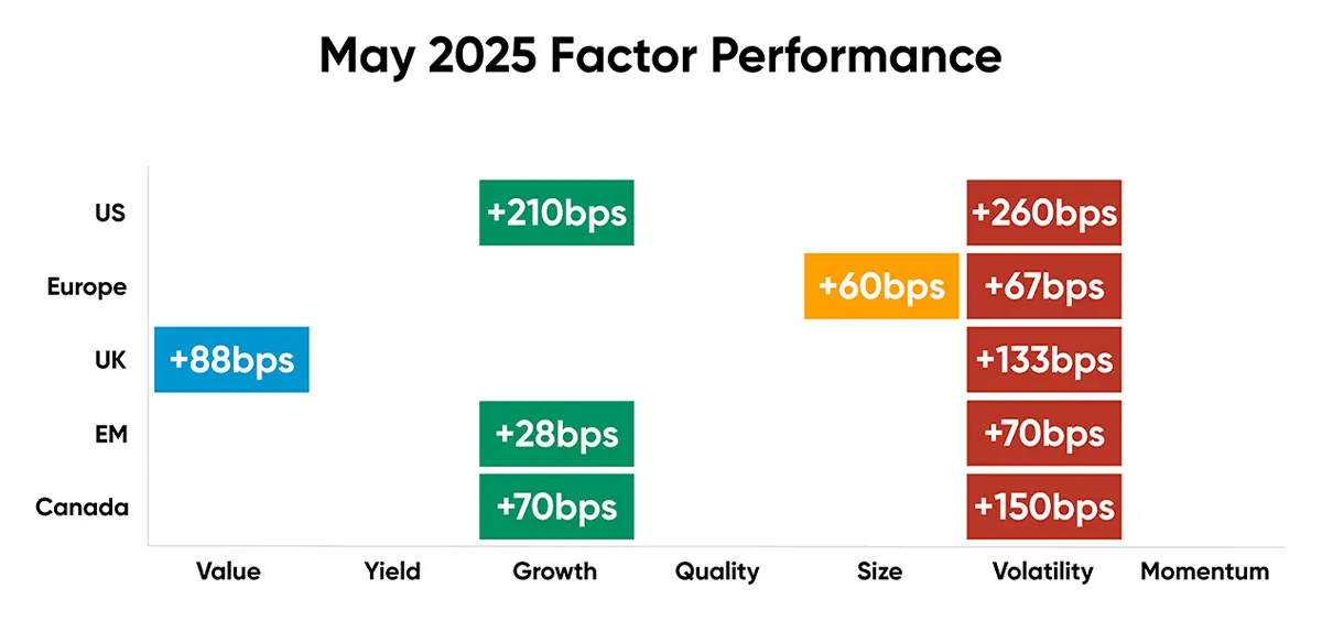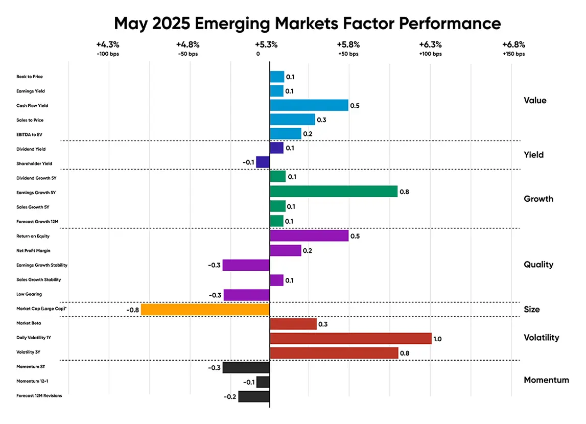 Emerging markets posted positive returns in May, with Volatility and Growth factors outperforming those in European markets. This strength was primarily driven by the Volatility and Growth factors. Although Value was not a leading contributor, it did show a notable trend reversal from last month’s negative performance. Meanwhile, the underperformance of the Size factor—particularly large-cap companies—persisted in the region.