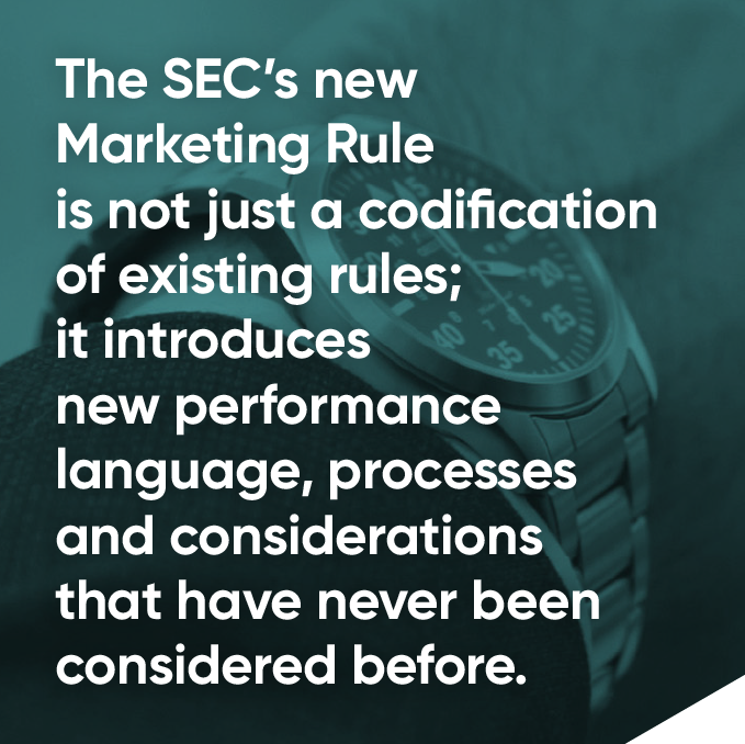 Although more clarification, staff interpretation and learnings will likely come to light in the next year or so, now is the time to get your compliance house in order. Make the best use of technology tools, counsel, and compliance experts to ensure you are ready to comply with the changes driven by the marketing rule – and any future ones down the road.