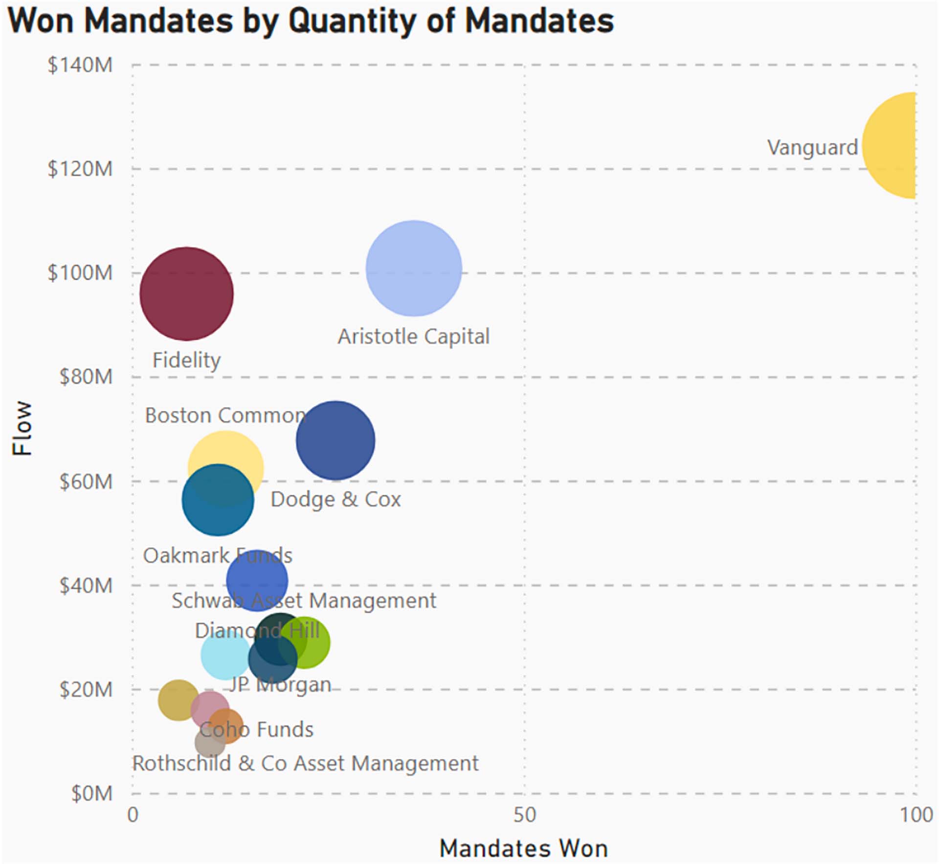 The top three winning managers of active U.S. Large-Cap value mandates within the Non Profit channel the last three years were Vanguard, Aristotle & Fidelity. While Vanguard had net cash flows of $124m, Aristotle won more consistently (76% of the quarters).
