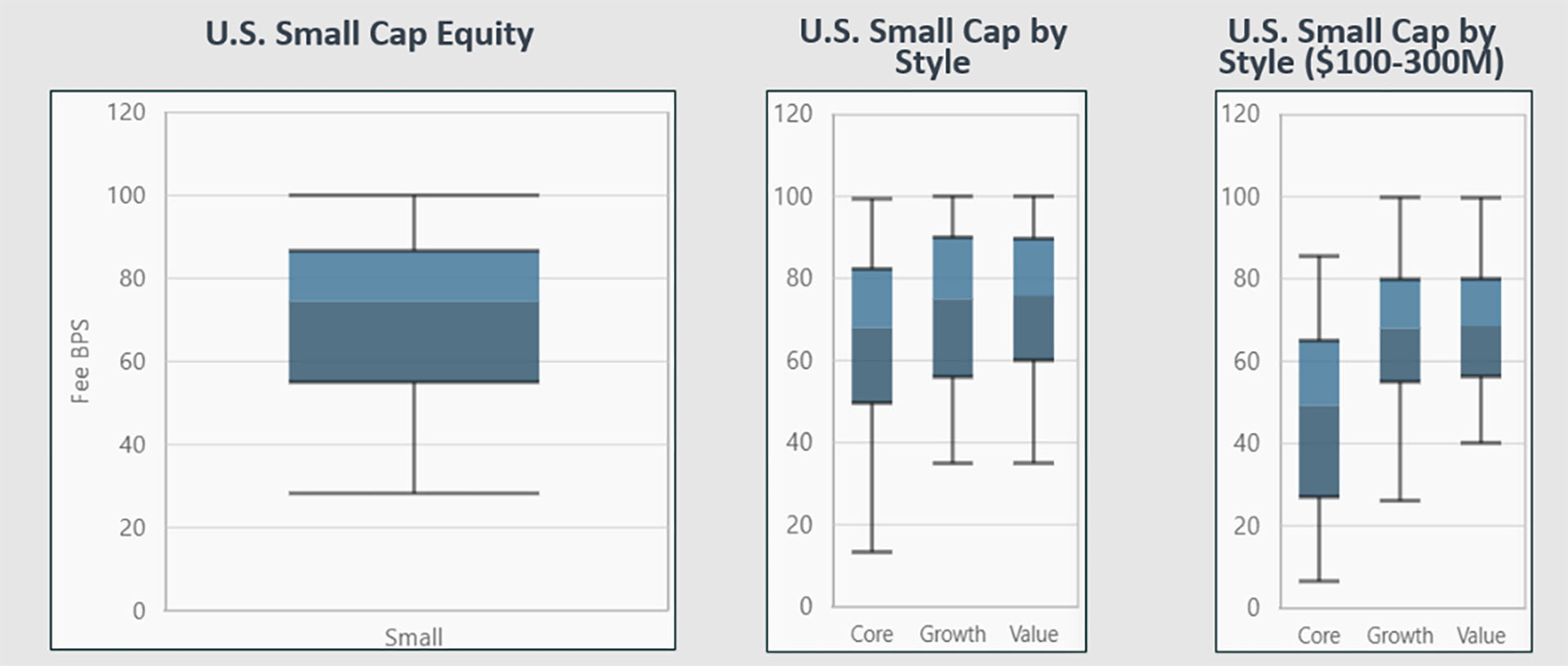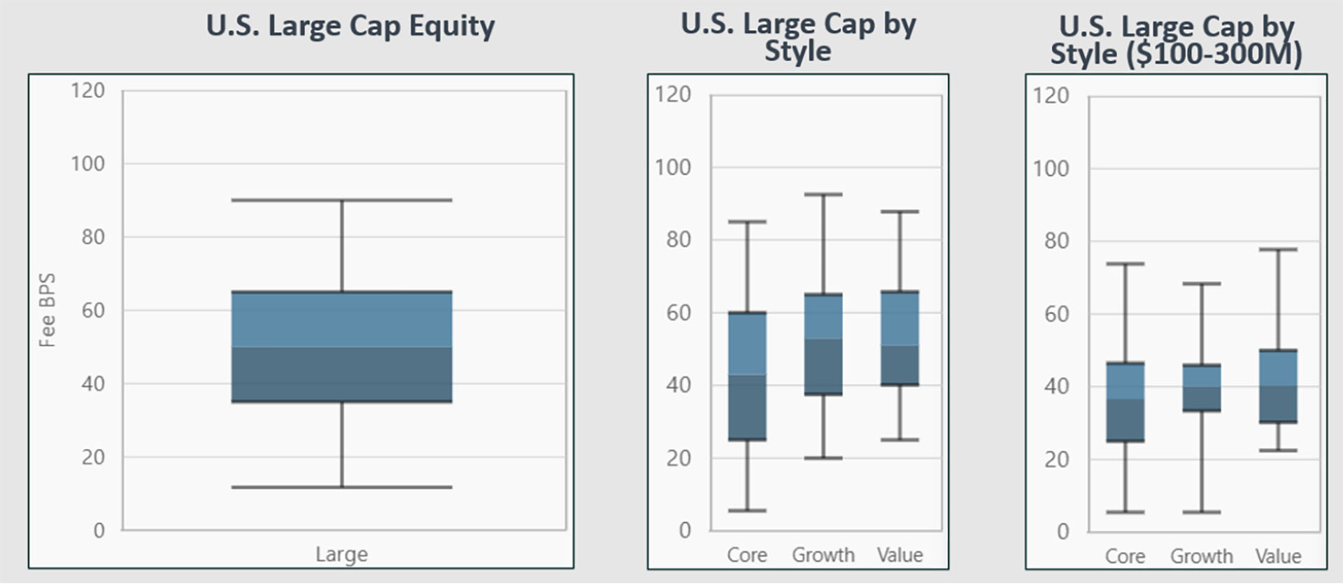 - Reviewing post-negotiated fees, active U.S. Large-Cap Value mandates are paid at a slight discount compared to Growth, while there is a premium paid for Value in Larger active U.S. Small-Cap mandates.