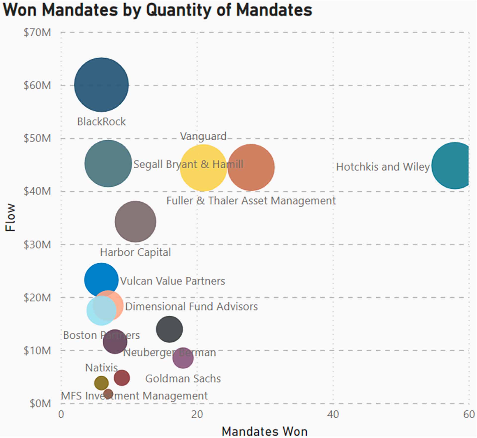 The top five winning managers of active U.S. Small-Cap value mandates within the Non Profit channel the last three years were BlackRock, Segall Bryant & Hamill, Vanguard, Fuller & Thaller, and Hotchkiss & Wiley. While BlackRock had net cash flows of $60m, Hotchkiss & Wiley won more mandates (58 vs. 6) and won more consistently (92% of the quarters).