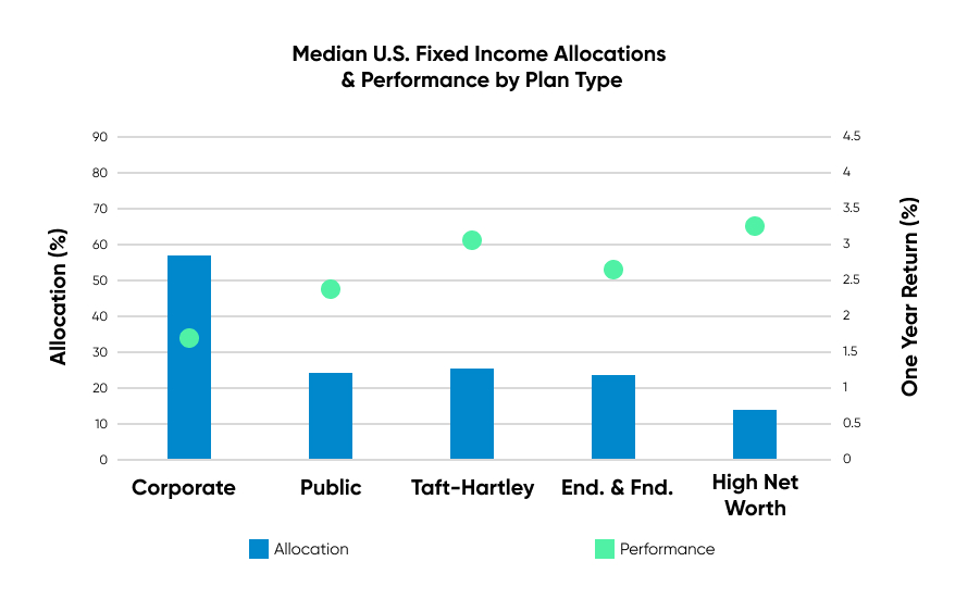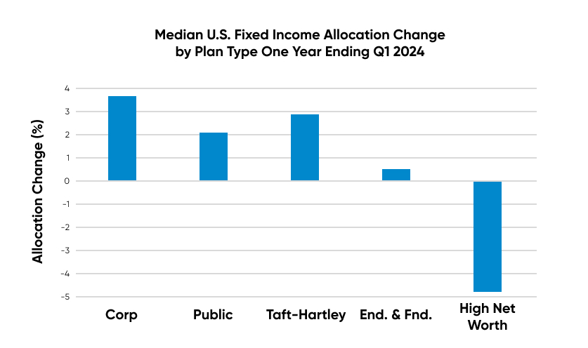 All plan types other than High Net Worth increased their allocation to U.S. Fixed income over the last year. Corporate plans, which have the highest allocation to the asset class at 57%, also increased their allocation more than any other plan type during the last year.