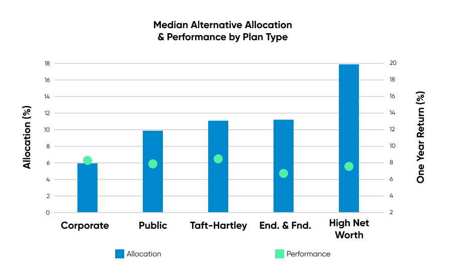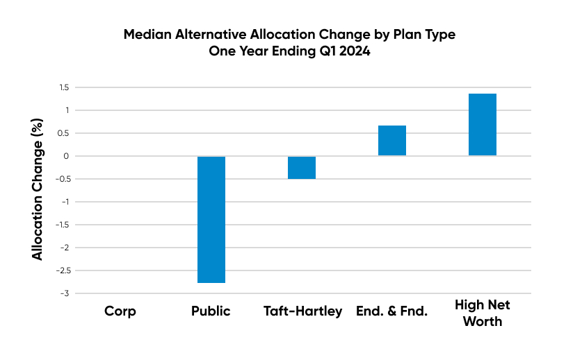 The plans that increased their allocations to Alternatives during the last year (High Net Worth and Endowments & Foundations) also have the highest allocations. Public plans had the largest pullback to alternatives during the year, down over 2.5% at the median level.