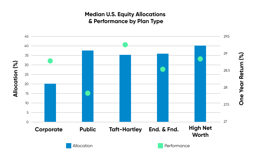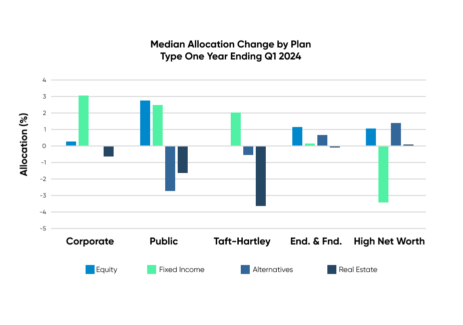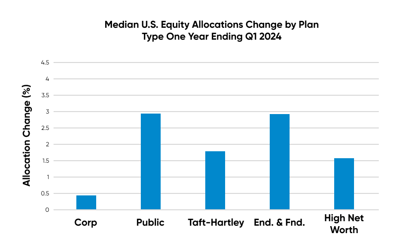 The public U.S. equity market posted very strong returns in Q1 2024; for defined benefit plans, the median U.S. equity return was 9.87%. Corporate plans continue to be underweight U.S. equity with a median allocation of 20%, roughly half the allocation compared to other plan types. All plan types increased their allocation to U.S. equity for the year ending March. High Net Worth plans, the best-performing plan type for the year, increased their allocation to U.S. equity to 40%.