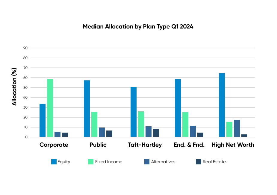 High Net Worth investors returned 5.49% at a median level in Q1 of 2024, outperforming all plan types. Comparatively, Corporate DB plans returned 1.46% for the quarter. While long bond performance in December buoyed corporate plan performance last quarter, that same exposure underperformed in Q1; therefore, corporate plans lagged other plan types. The plans with the highest exposure to equity (Public, Endowments & Foundations, High Net Worth) posted the most robust performance for the quarter and were the three plan types to outperform a traditional 60/40 benchmark return of 4.63%. (60% MSCI ACWI Index/ 40% Bloomberg Barclays U.S. Aggregate Index).