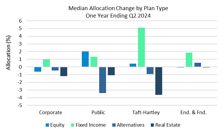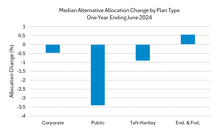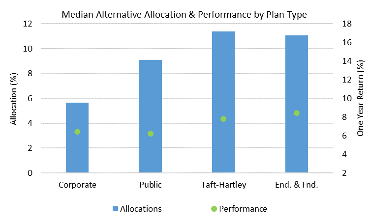 Endowments & Foundations, which posted the strongest performance over the last year, were the only plan type to increase their allocations to Alternatives during the last year. Public plans had the largest pullback to alternatives during the year, down over 3% at the median level.