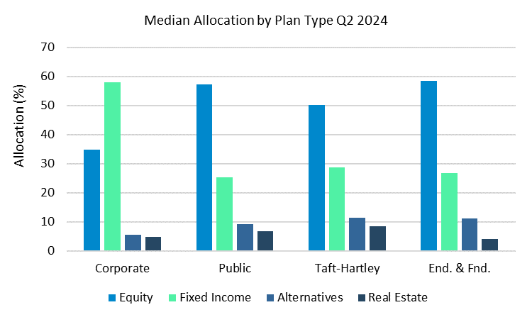 Endowments & Foundations returned 1.18% at a median level in Q2 of 2024, narrowly outperforming Public & Taft-Hartley plans. Comparatively, Corporate DB plans returned 0.14% for the quarter, lagging other plan types by 1%. The plans with the highest exposure to equity (Public, Taft-Hartley. Endowments & Foundations) posted the strongest performance for the quarter. However, no plan types outperformed a traditional 60/40 benchmark return of 1.83%. (60% MSCI ACWI Index/ 40% Bloomberg Barclays U.S. Aggregate Index).