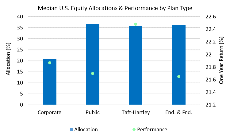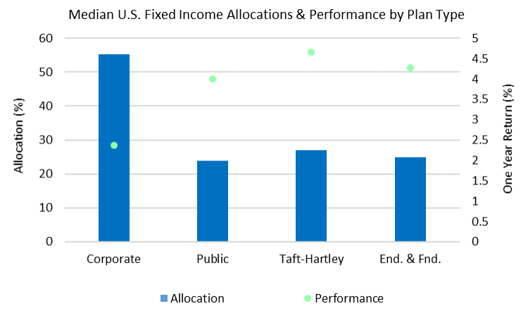 - Corporate defined benefit plans, driven by their fixed income allocation to long bonds and low exposure to equity, were the worst performers by plan type during the quarter, returning 0.14% at a median level.