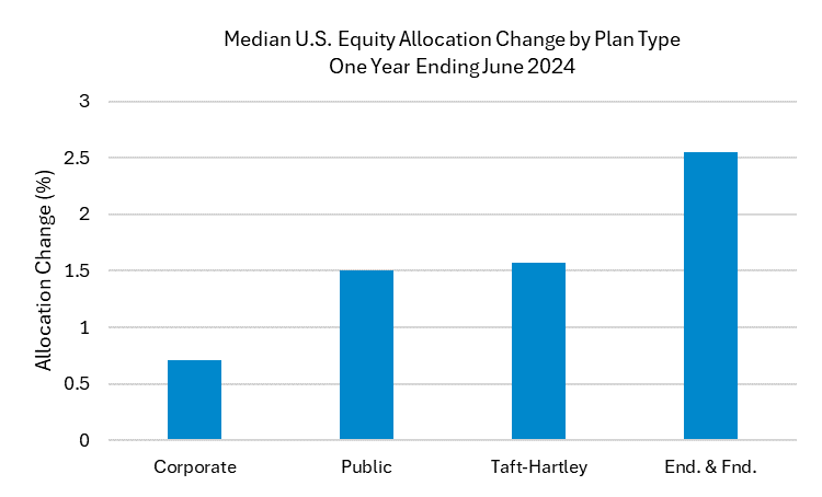 The public U.S. equity market posted positive returns in Q2 2024. For defined benefit plans, the median U.S. equity return was 2.55%. Corporate plans continue to be underweight U.S. equity, with a median allocation of 20.8%, roughly 60% of the allocation compared to other plan types. For the year ending June, all plan types increased their allocation to U.S. equity.