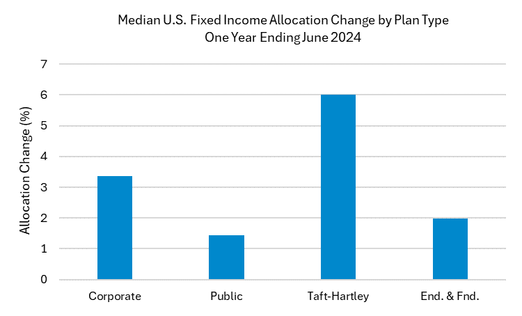 All plan types increased their allocation to U.S. Fixed income over the last year. Taft-Hartley plans have increased their allocation by 6% (from 21% to 27%) in the last year. Corporate plans, which have the highest allocation to the asset class at 55%, also increased their allocation by more than 3% during the last year.