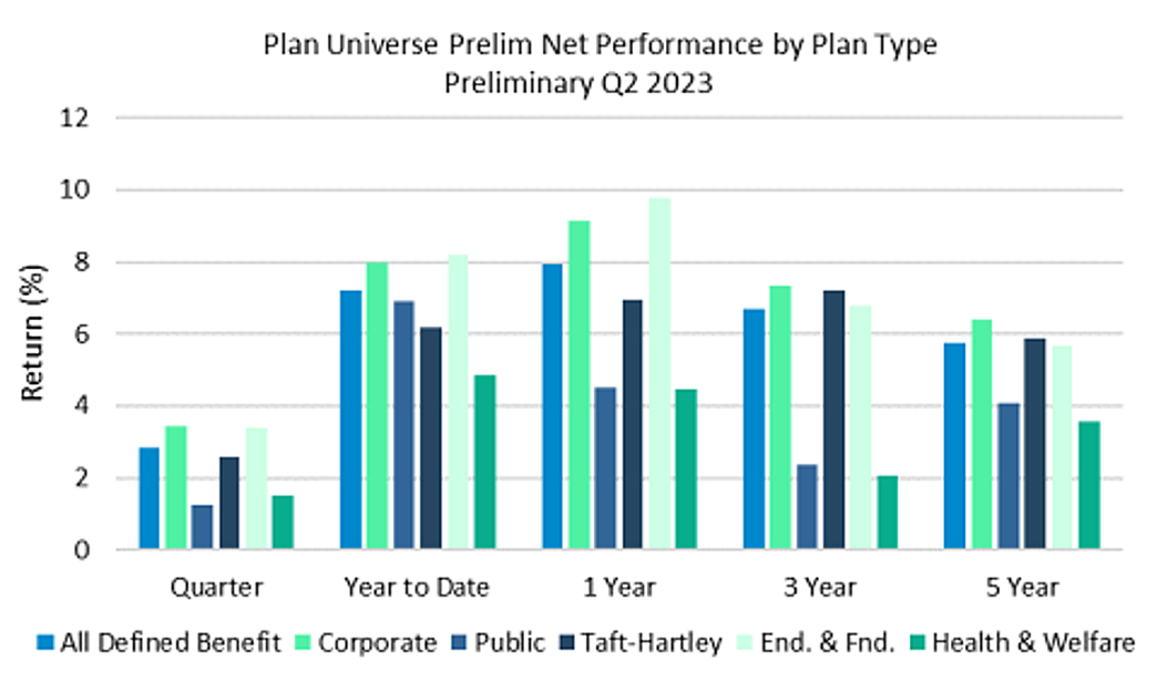 In Q2, public plans and endowments & foundations posted the strongest performance with median returns of 3.42% and 3.39%, respectively.