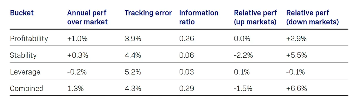 • Quality investing (through profitability and stability based sub-factors) provides meaningful downside protection (Table 1) but has not demonstrated outperformance in upside markets.